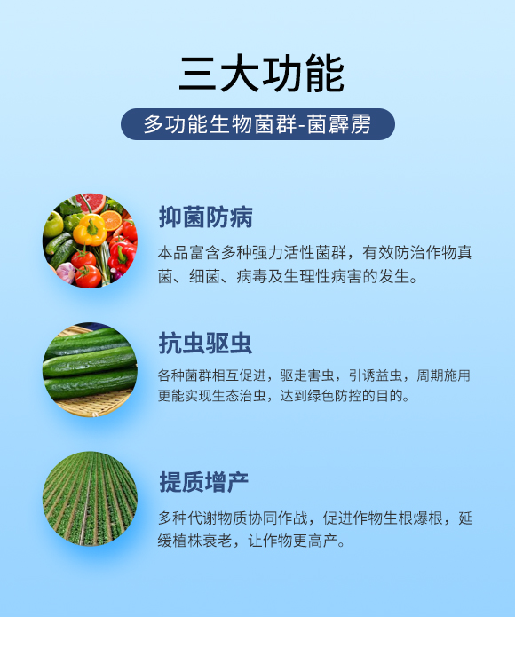 本品富含多種強(qiáng)力活性菌群,其新陳代謝的二次分泌物質(zhì)和活性酶物質(zhì)能大大抑制有害菌,搶占有害菌群生存環(huán)境,降低作物病害發(fā)生,有效防治作物真菌、細(xì)菌、病毒及生理性病害的發(fā)生。